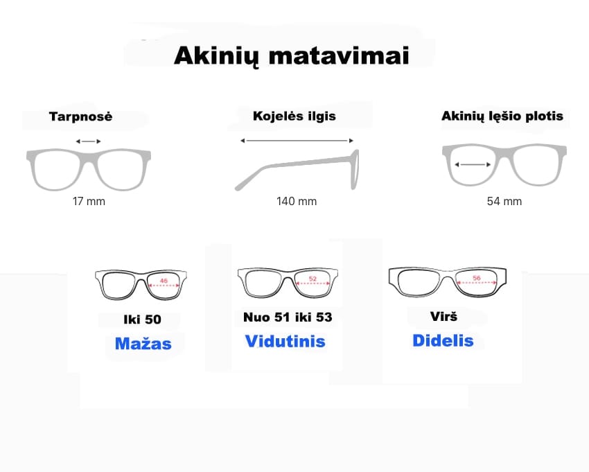 Akinių lęšio plotis 55 Tarpnosė 15 Kojelės ilgis 145