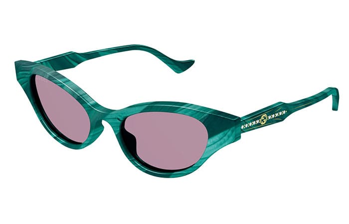 Gucci GG1298S 003 green violet 51. Kolekcijoje derinamos stilingos akinių formos su plačia spalvų palete.